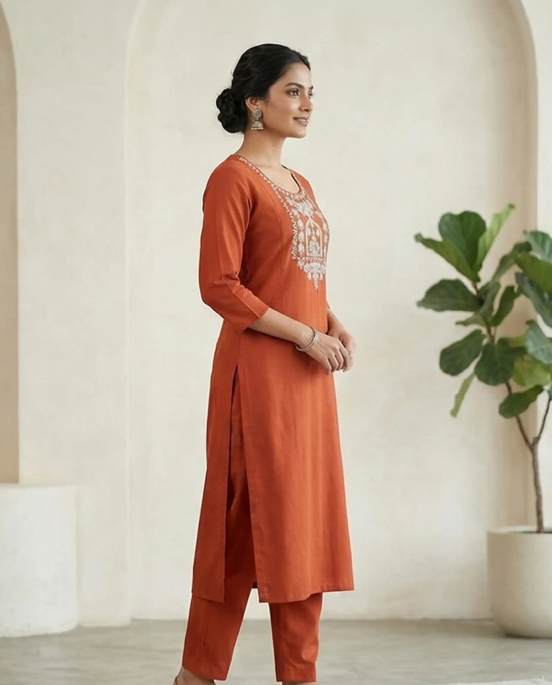 Elevate your ethnic wardrobe with this elegant rust-colored kurti set from Sherly's Attire. Crafted from premium, smooth cotton silk fabric, this 3/4th sleeve kurti features a beautifully detailed white embroidered yoke for a sophisticated look. The set is paired with matching straight-cut pants designed with an elasticated waistband for a comfortable, adjustable fit, making it perfect for both festive occasions and professional office wear.