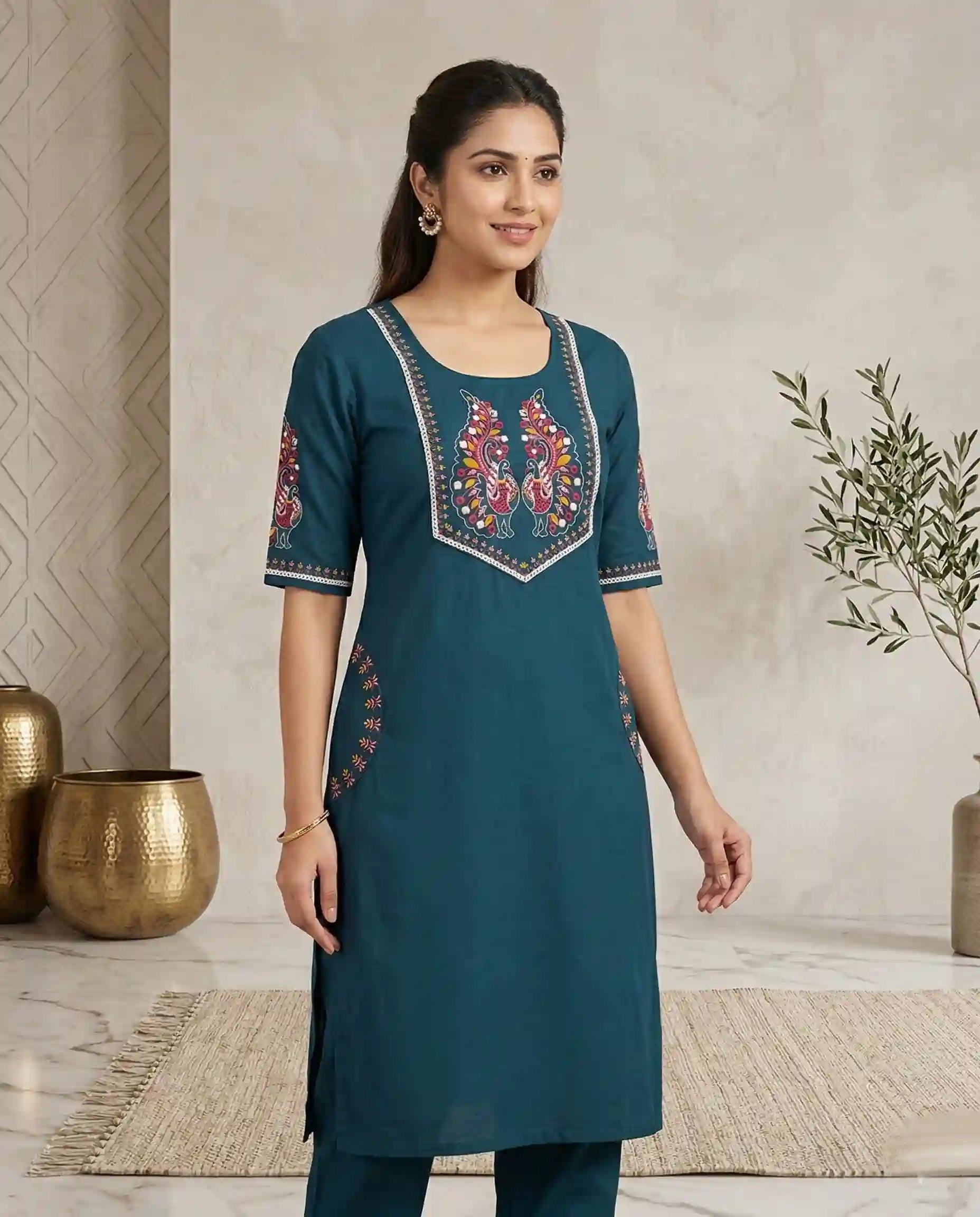 Elevate your ethnic wardrobe with our stunning Teal Blue Embroidered Kurti Set. Crafted from premium, breathable cotton, this set offers a perfect blend of traditional artistry and modern comfort.