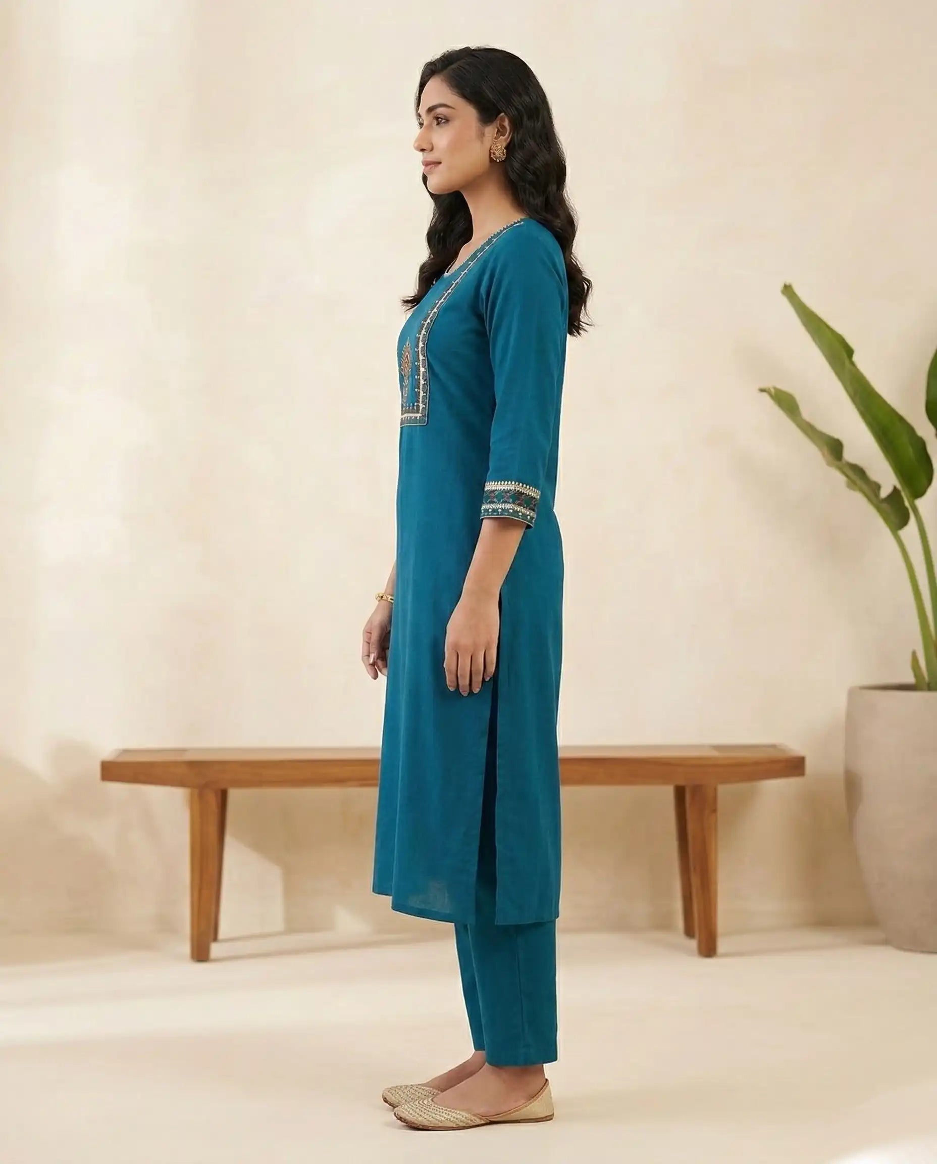 Add a touch of elegance to your daily wardrobe with this Teal Blue Embroidered Kurti Set. Featuring a beautifully detailed yoke and matching embroidery on the 3/4 sleeve cuffs, this outfit is designed for both comfort and style.