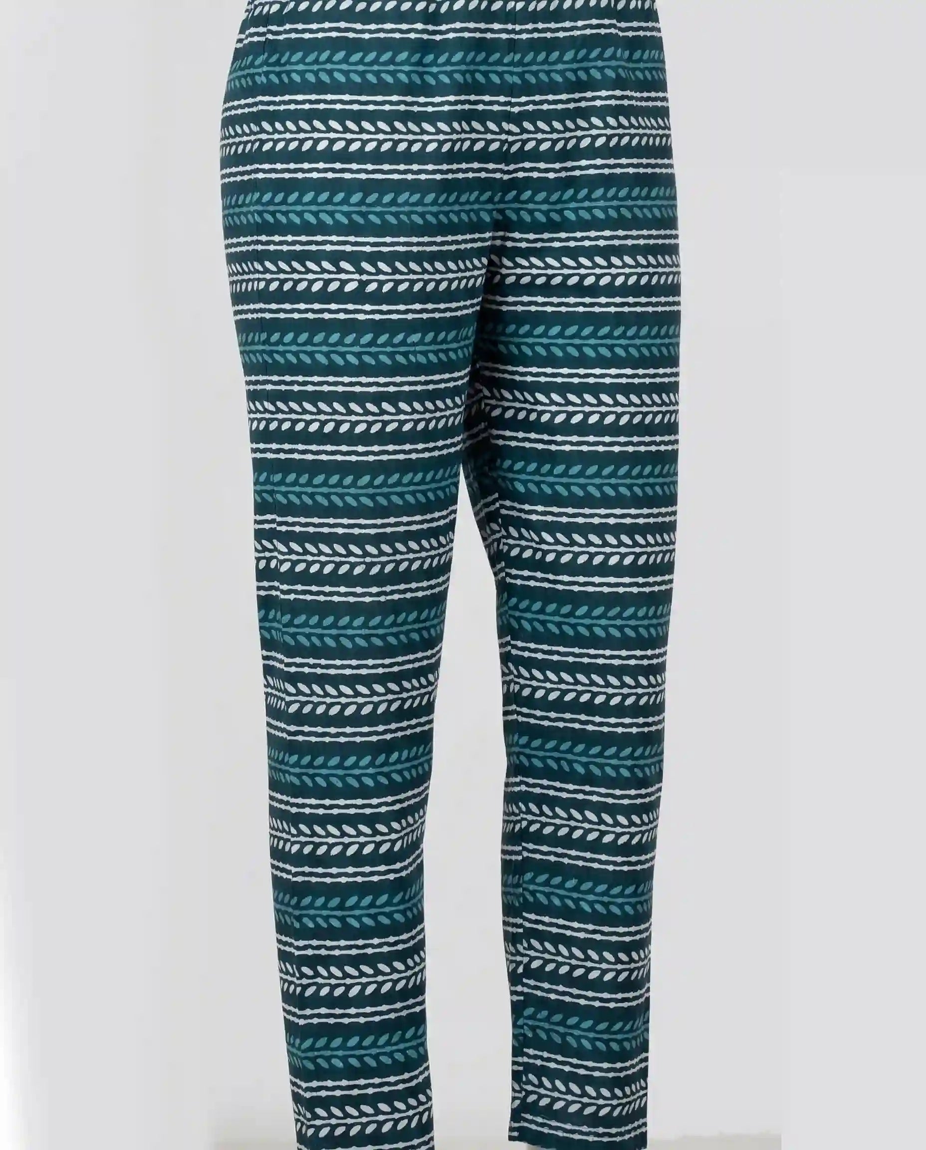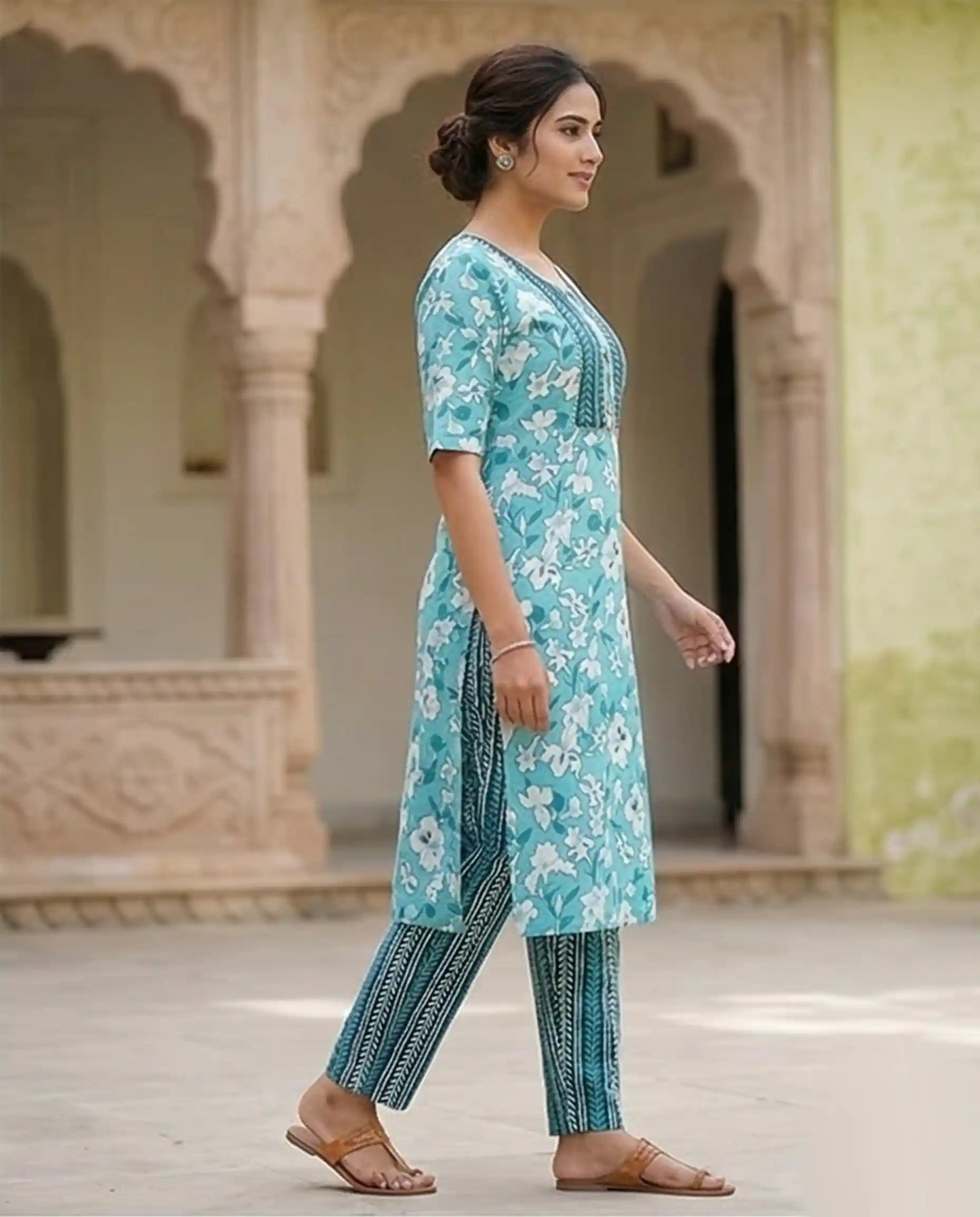 Elevate your everyday ethnic style with this vibrant Turquoise Blue Floral Kurti Set. Crafted from breathable, high-quality cotton, this two-piece ensemble features a straight-fit kurta adorned with elegant white floral motifs. The contrasting dark blue yoke is detailed with intricate patterns and classic wooden buttons for a sophisticated touch. Paired with comfortable, matching teal blue trousers featuring a unique horizontal leaf print, this set is perfect for office wear, casual outings, or festive daytime events.