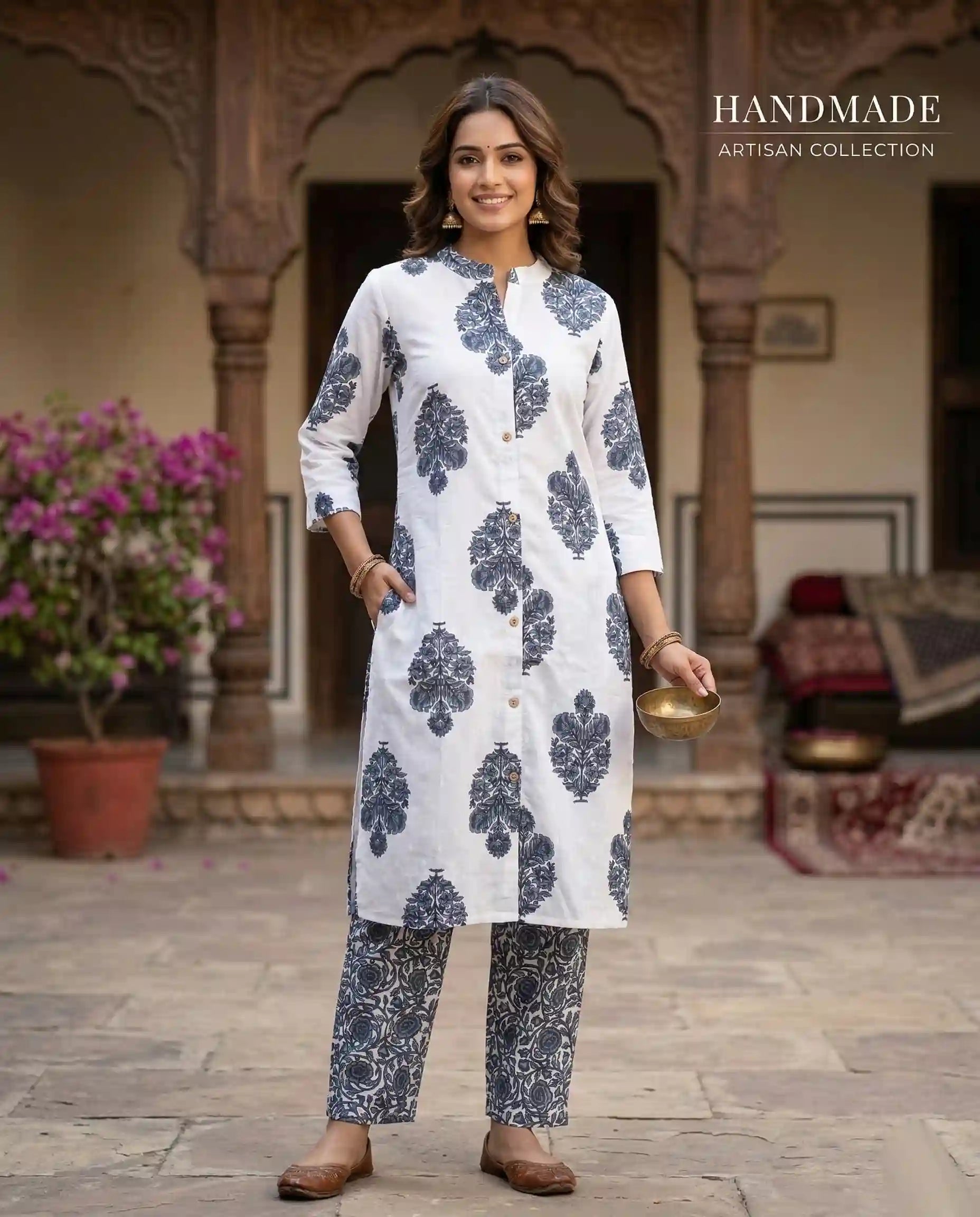 The straight-cut kurta is adorned with intricate hand-block inspired floral tree motifs, complemented by earthy wooden buttons that add a touch of rustic charm. Paired with matching floral-patterned trousers, this ensemble offers a cohesive, chic look that celebrates the beauty of artisanal prints.