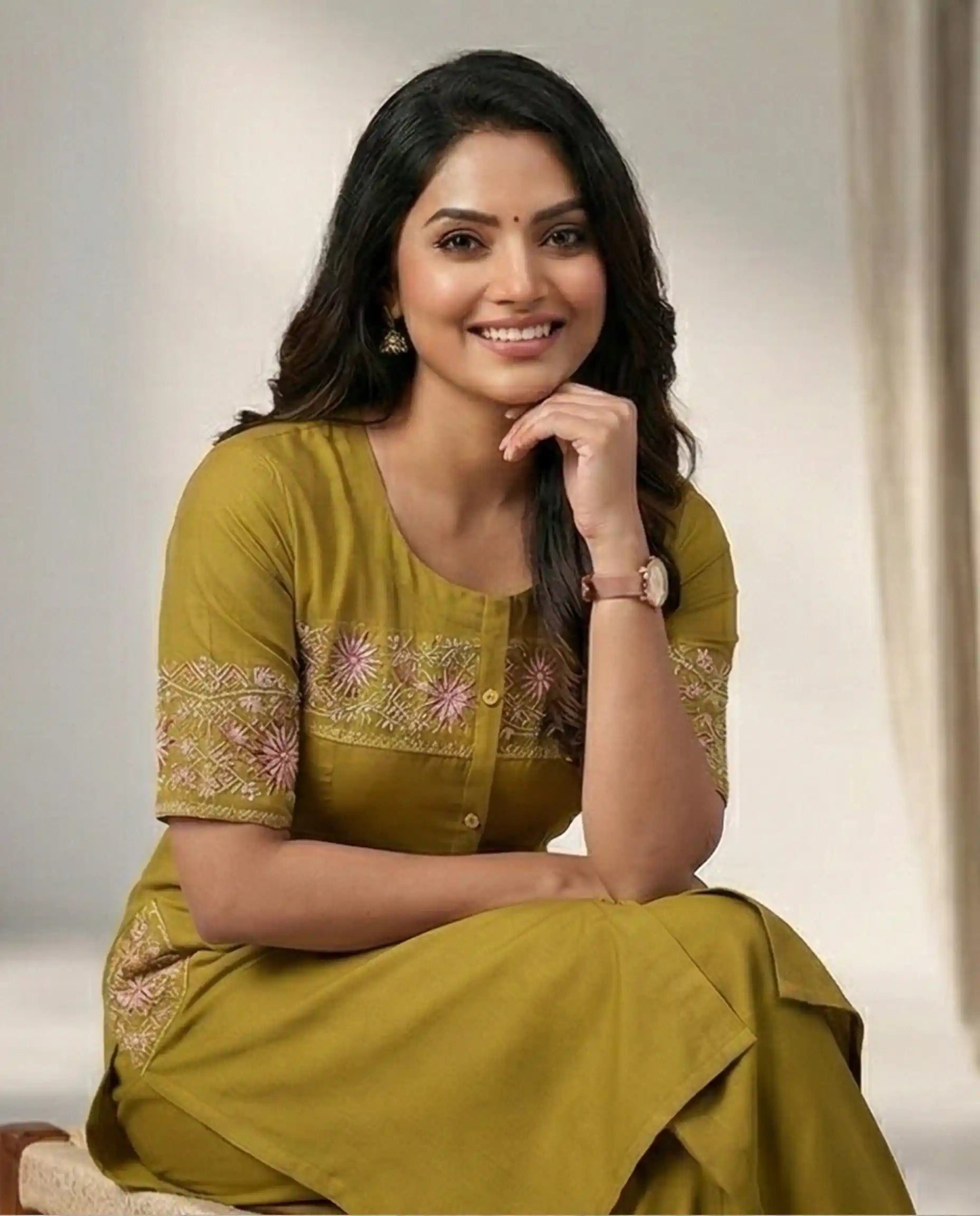 Elevate your ethnic wardrobe with this elegant Olive Green Kurta and Palazzo Set. Crafted for both style and comfort, this co-ord set features a sophisticated button-down kurta adorned with intricate pink and beige floral embroidery on the yoke and sleeve borders.